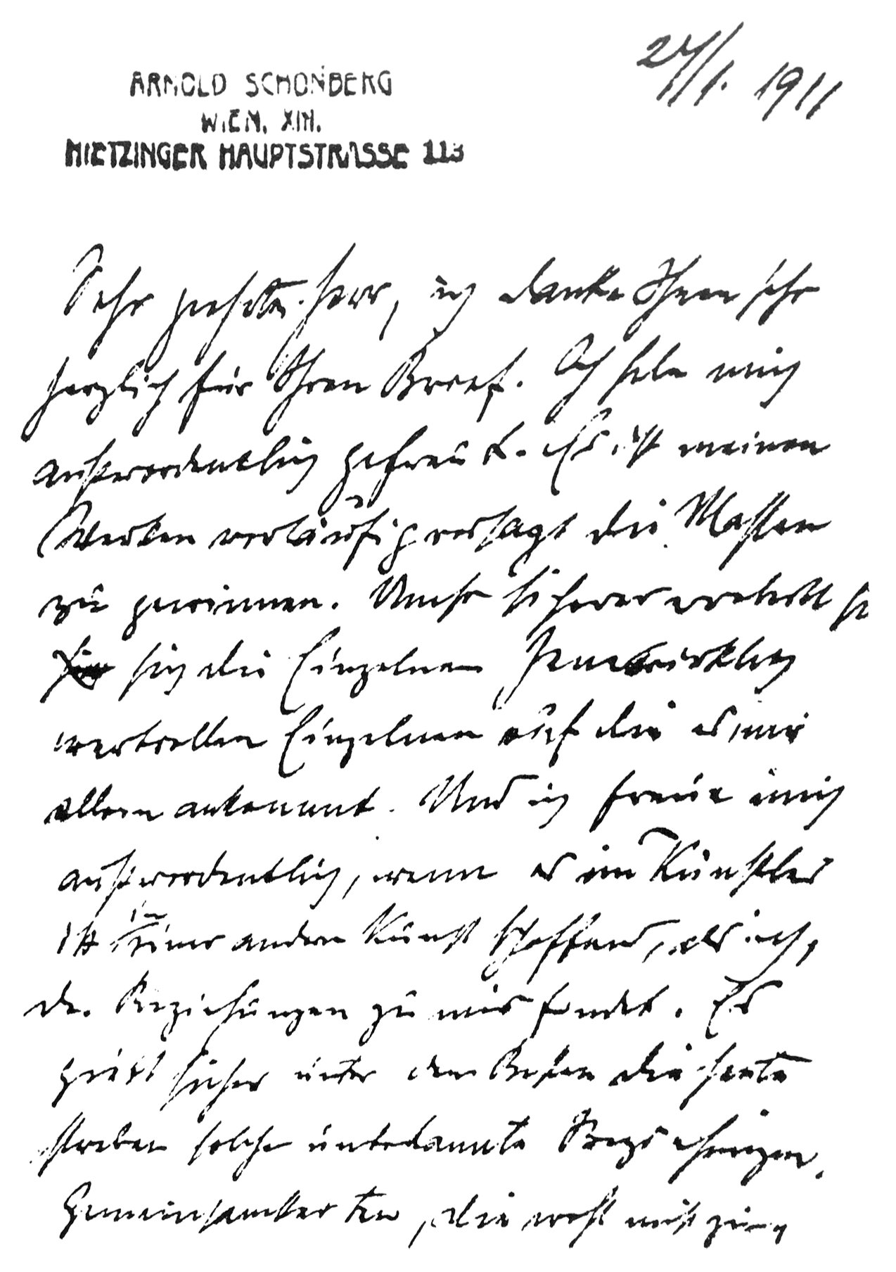 Я прошу прощения, что, не имея удовольствия знать Вас лично, обращаюсь к Вам напрямую. Недавно я услышал Ваш концерт и испытал подлинное наслаждение1. Разумеется, Вы не знаете меня, точнее, моих работ, поскольку я вообще редко выставляюсь, в Вене же выставлялся лишь один раз, и то ненадолго, примерно год назад (в рамках Сецессиона). Но наши устремления, равно как весь образ мыслей и чувств, имеют так много общего, что я считаю себя абсолютно вправе выразить Вам мою симпатию.