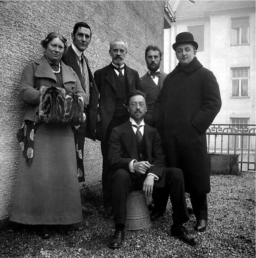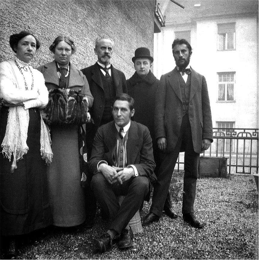Слева направо стоят: Мария и Франц Марк, Бернард Кёлер, Генрих Кампендонк, Фома Гарман. В центре сидит – Василий Кандинский. Терраса дома Кандинского в Мюнхене. 1911.