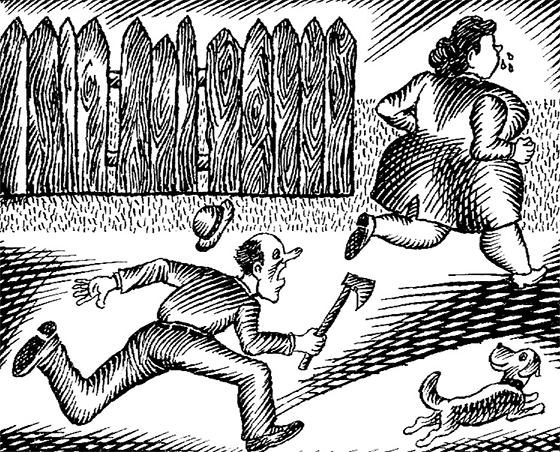 По субботам маленький Харитон напивался, хватал топор и с криком «Убью!» гонялся за своей огромной женой. Подойти к нему никто не отваживался: он с такой яростью орал «убью», что стаи ворон начинали кружить в ожидании трупа.