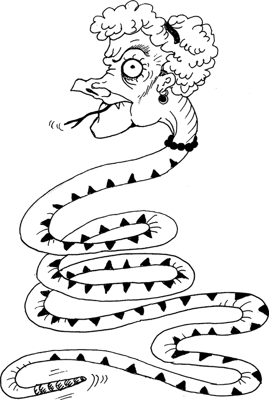 Марфа Леонидовна преподавала химию в соседней школе, была заседателем в суде, поэтому её все побаивались. Она была строгой и всегда недовольной, отчитывала всех, делала замечания… Вместо выражения лица у неё было постоянное возражение. Она напоминала шипящую змею, и Борис утверждал, что у неё даже язык – раздвоенный. Он называл её «Марфа Людоедовна».