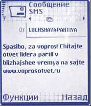 Такой сайт отличается от персонального интернет-сайта прежде всего объемом и форматом предоставляемой информации. Несмотря на достижения шагаюших семимильными шагами производителей мобильных телефонов, большинство российских пользователей сотовой связи пока имеют аппараты, экран которых значительно уступает экрану монитора. Однако для информации, которая распространяется с помощью технологий мобильной связи, большего и не требуется. WAP реализует главную функцию мобильной связи как таковой, оказываясь всегда под рукой абонента, в данном случае избирателя. Дело политических консультантов или представителей избирательного штаба – сформировать на основе этого протокола каталог и наполнить его актуальной новостной, развлекательной, агитационной составляющей, продвигать лидеров партии или собирать участников будущей акции. Главное – принять решение, каким образом будут использоваться возможности технологий мобильной связи: комплексно, с помощью коммуникационного центра, или каждый раз как отдельный проект на этапе избирательной кампании.