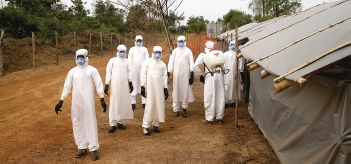 В первых числах октября наконец-то прибыла подмога – хоть и ненадолго. Весть о страшной новой болезни наконец-то добралась до заирских властей, и они незамедлительно отправили к очагу эпидемии военных, чтобы те оцепили деревню, изолировав ее от внешнего мира. К тому времени умерло больше сотни человек. Заирские врачи, доставленные в поселок на вертолете, взяли кровь у инфицированных пациентов и немедленно полетели обратно в столицу, город Киншаса, находившийся вне зоны первичного распространения инфекции.