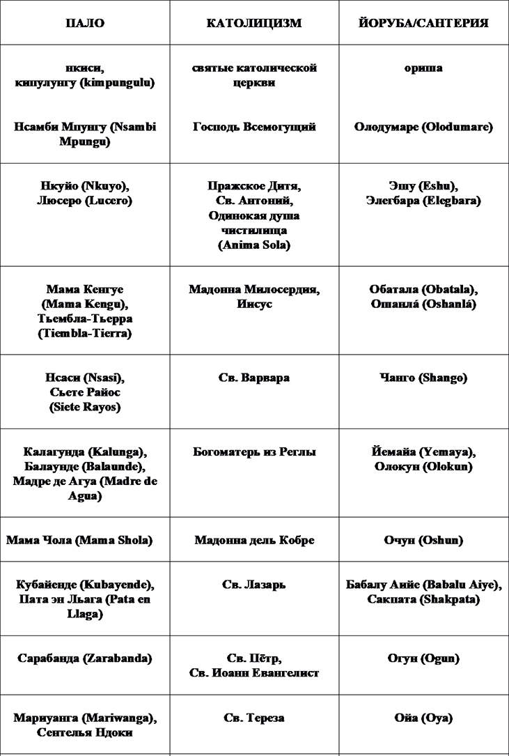 В пору преследований, которые время от времени возобновлялись вплоть до середины XX века, палеро были вынуждены скрывать своих божеств под обликом католических святых. В Африке же нганга установили соответствие между своими божествами и аналогичными духами в пантеоне йоруба. Далее приводится перечень наиболее почитаемых божеств и их католических аналогов, а также их имена на йоруба.
