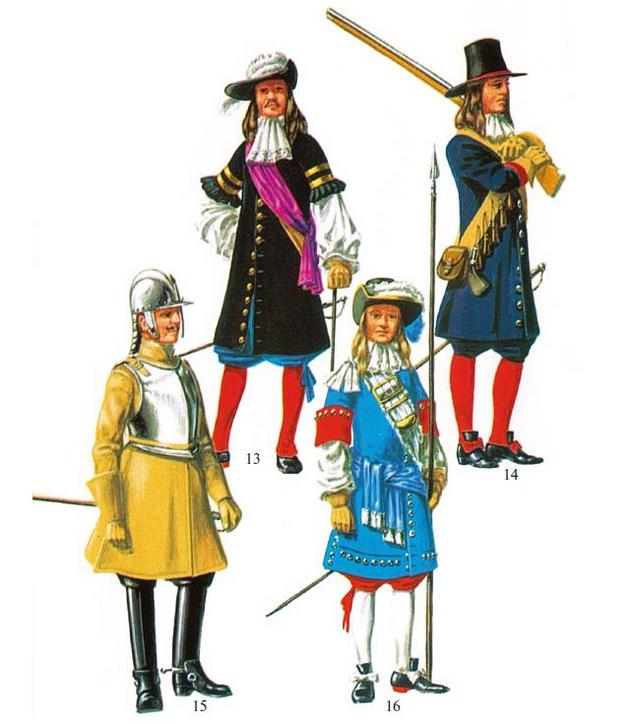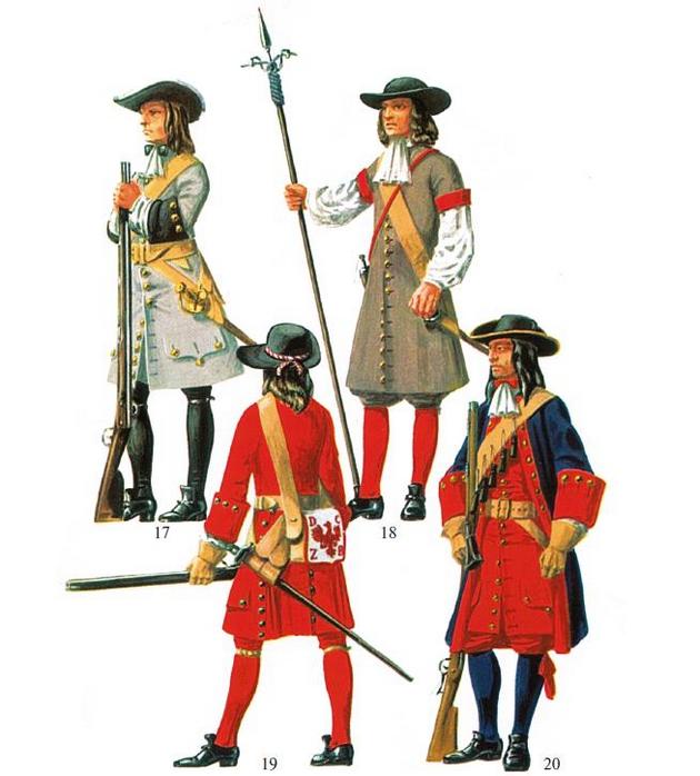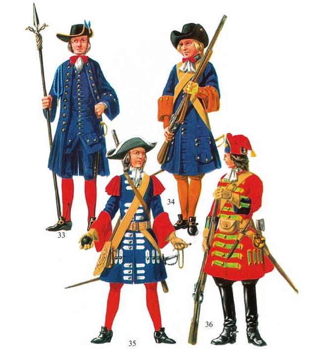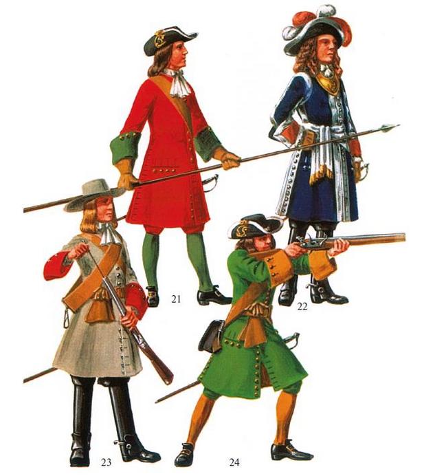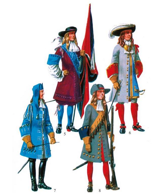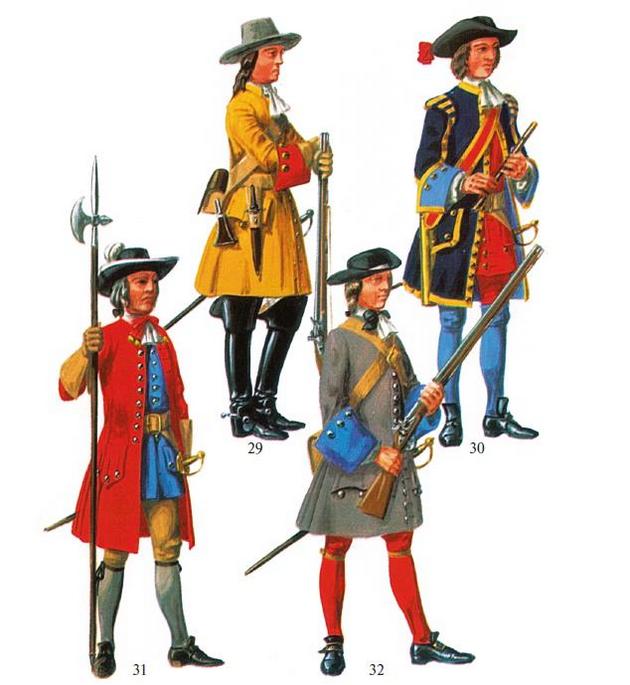 Этот полк, сформированный в 1631 году, один из старейших в ганноверской армии. В его униформе соседствовали черты и старого и нового. Ношение верхнего камзола нараспашку, так чтобы была видна куртка под ним, – явная новинка, тогда как кожаные бриджи и чулки неконтрастного цвета у пехотинцев – старомодны, как и скромные ботинки со шнурками, так как в этот период уже становились привычными черные башмаки с пряжками.