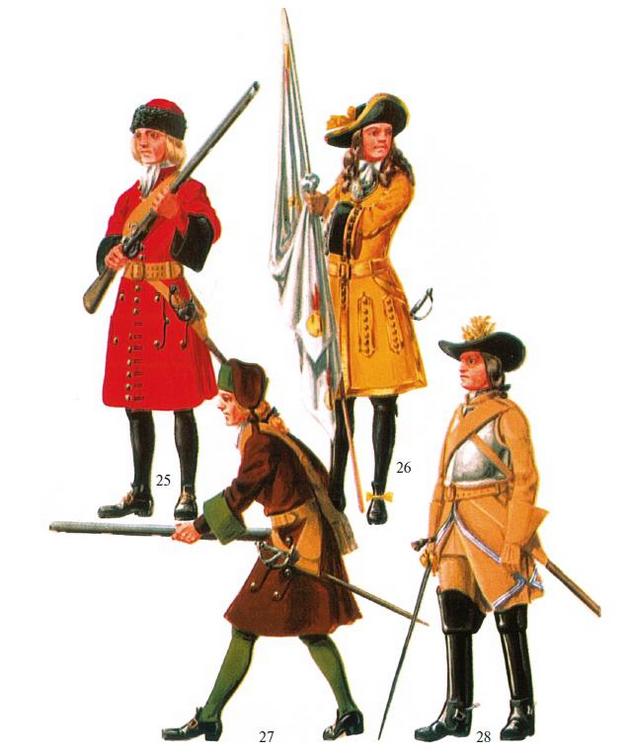 Цвета первых униформ выбирались командирами полков, но Петр Великий под влиянием и своих союзников, и противников, принявших единую униформу, ввел в 1720 году стандартную темно-зеленую униформу. Этот цвет оставался характерным для русской пехоты до 1914 года. Форма головного убора, как показано на рисунке, была типично русской. Она была весьма практичной на севере, потому что цветной верх можно было опустить на шею.