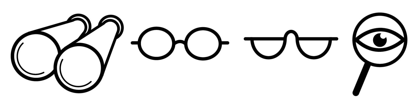 Эту иллюстрацию я использую для описания ролей в команде, многие нашли ее полезной. Представим наши дары, как набор различных очков. На одном конце спектра – бинокль, с помощью него человек может видеть очень далеко. Далее идут очки для близоруких, позволяющие читать дорожные знаки, например. Затем – очки для чтения, увеличивающие изображение в телефоне, книге или на компьютере. На другом конце спектра – лупа, она помогает различить тончайшие линии на дорожной карте.