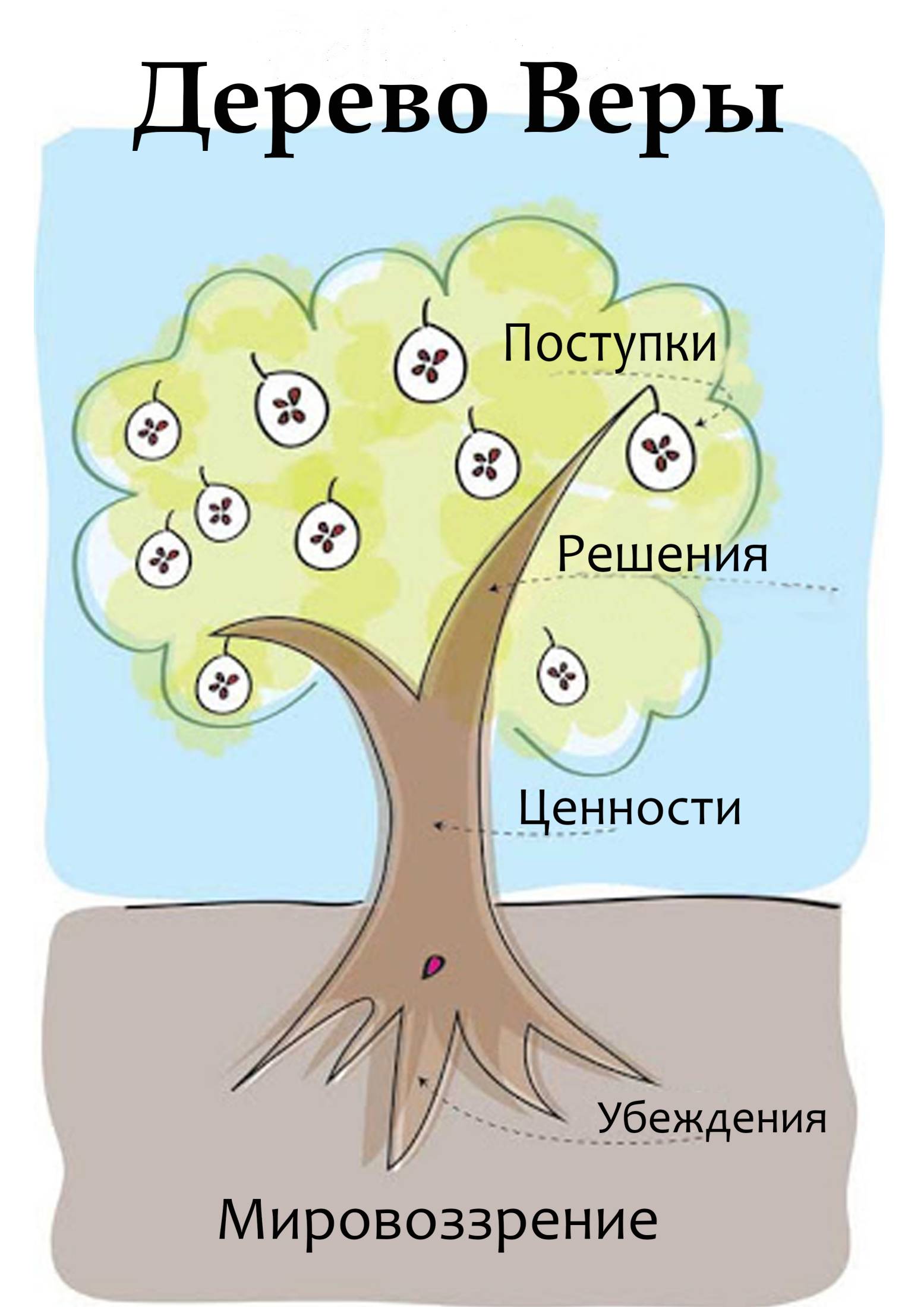 С позволения Дерроу я позаимствовала у него эту иллюстрацию и адаптировала её для МсМ. Это подвело меня к кардинальному переосмыслению нашего курса. Так устроено, что всё, чему мы учим, все модели, которые мы строим, «держатся» на том или ином убеждении. Иллюстрация с «Деревом веры» оказалась полезной в принятии как личных, так и командных решений.