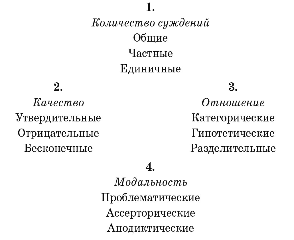 Если мы отвлечемся от всякого содержания суждений вообще и обратим внимание на одну лишь рассудочную форму суждений, то мы найдем, что функции мышления в них можно разделить на четыре группы, из которых каждая содержит три момента. Их можно хорошо представить в следующей таблице: