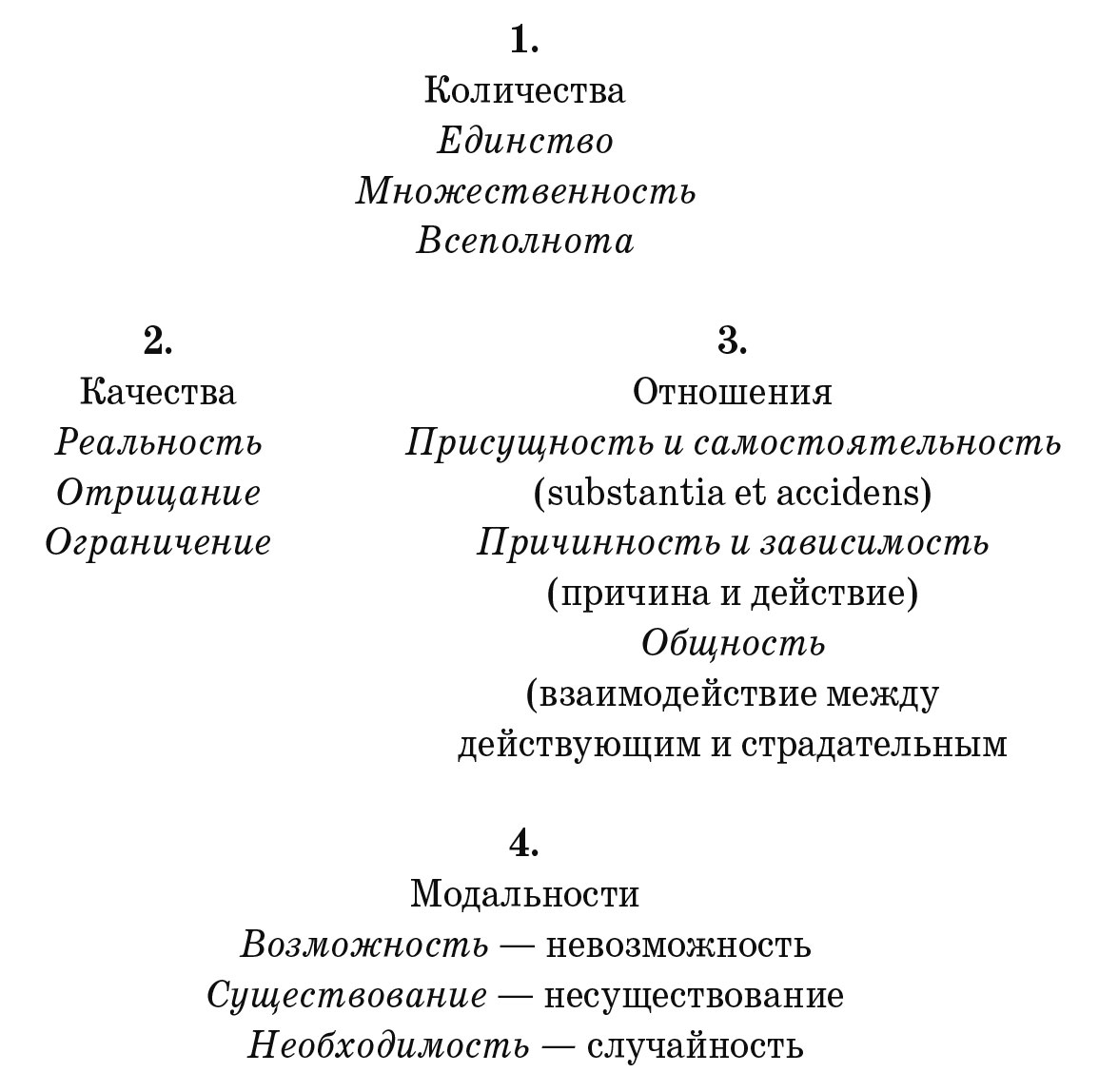 Этим путем возникает ровно столько чистых рассудочных понятий, a priori относящихся к предметам созерцания вообще, сколько в предыдущей таблице было перечислено логических функций во всех возможных суждениях: рассудок совершенно исчерпывается этими функциями, и его способность вполне измеряется ими. Мы назовем эти понятия, по примеру Аристотеля, категориями, так как наша задача изначально вполне совпадает с его задачей, хотя в решении ее мы далеко расходимся с ним.