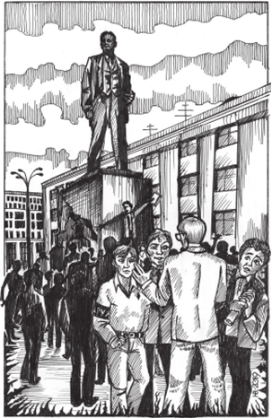 Когда я подошел к толпе, какой-то человек, забравшись на постамент, вместо ожидаемых стихов вдруг начал громко кричать, что Юра Гагарин ему нравится, а порядки в стране – нет! Толпа засвистела, зашумела… Потом его сменил неизвестный поэт, прочитавший сатирические стихи с явным антисоветским уклоном. Обстановка вокруг явно накалялась – какие-то люди из толпы слушателей стали пробираться к памятнику, чтобы стащить поэта и сдать «куда следует». Но группа молодых ребят как по команде цепью встала вокруг пьедестала, защищая выступавшего.