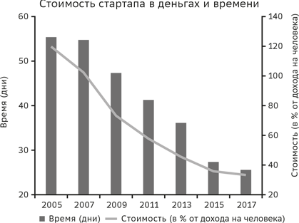 Несколько недель спустя Всемирный банк опубликовал исследование, в котором привел графики затрат финансов и времени, необходимых для создания новой компании в период с 2005 по 2017 год. За эти 12 лет оба показателя сократились более чем в два раза. Когда я прочитал об этом, я вспомнил пример Пателя.