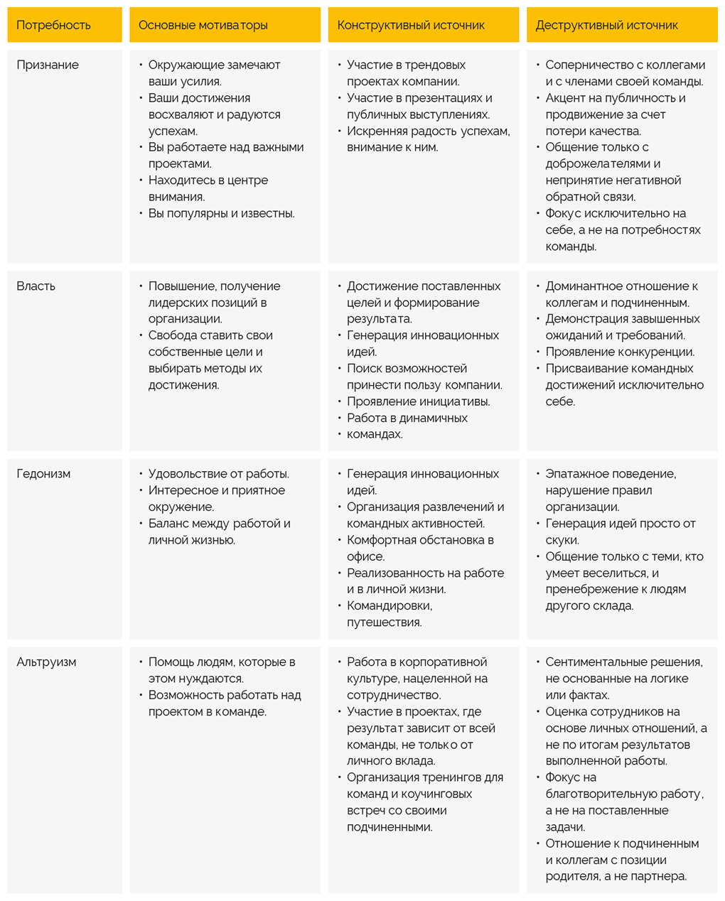 Таблица 1. Источники удовлетворения потребностей, соответствующих основным лидерским ценностям