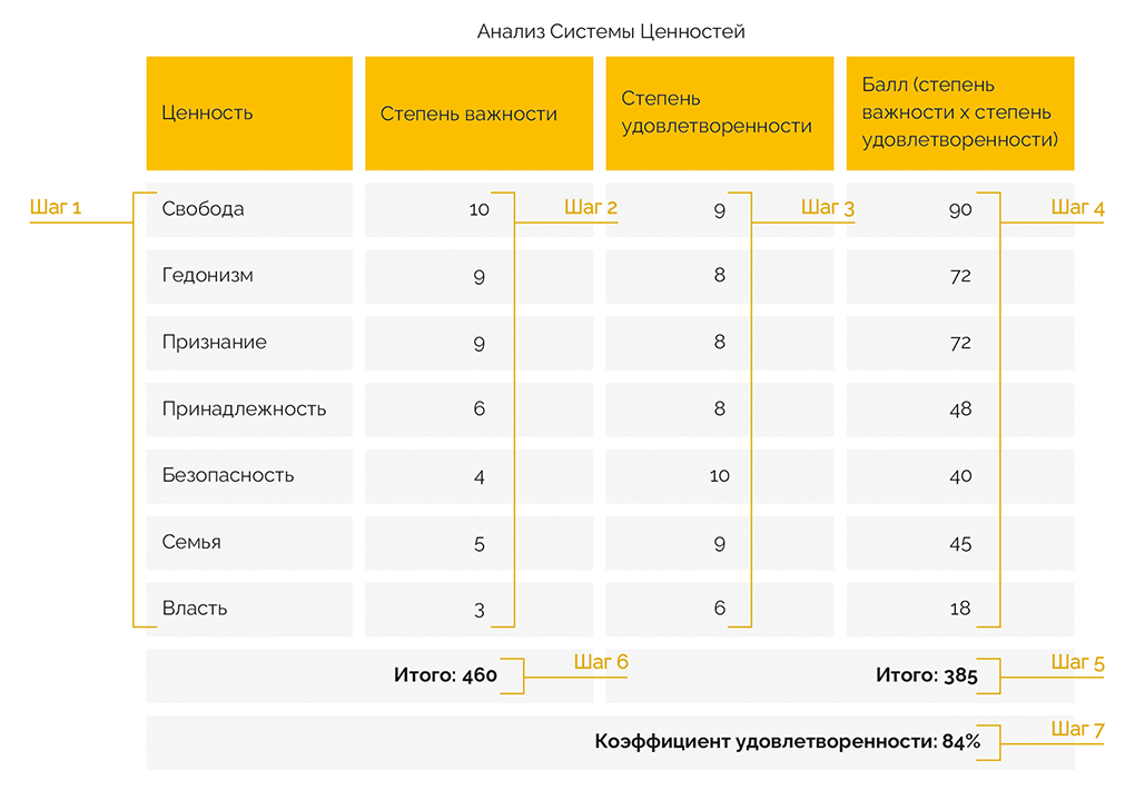 Чтобы проанализировать, насколько ваши ценности удовлетворены, можете воспользоваться следующим алгоритмом.