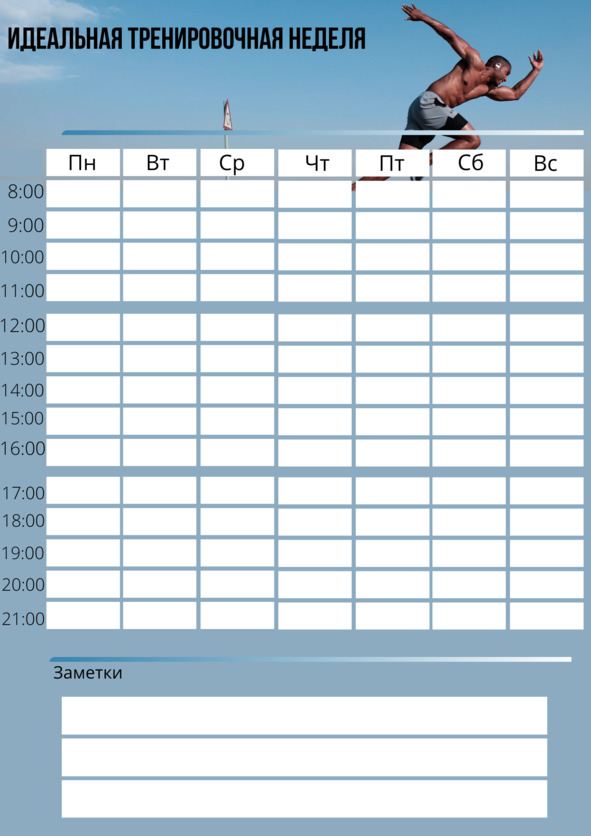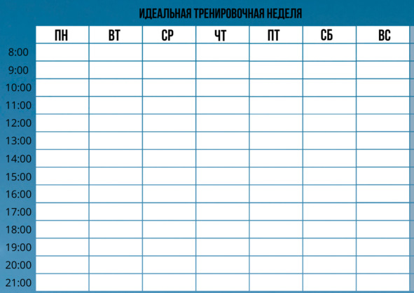 В ней должны быть столбики с днями недели и строки с видами тренировки и восстановительными процедурами в определенный час времени.
