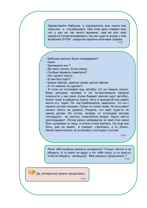 Самое интересное, что когда он оправил все эти сообщения путем мессенджера, то увидел отметку о том, что они доставлены, а также что Елена их просмотрела, однако прочитала или нет было не ясно, но то что просмотрела это было видно. При этом от нее не было никакого ответа, она ничего не стала писать в ответ, ни звонить, была абсолютная тишина.