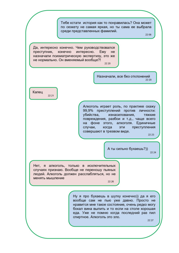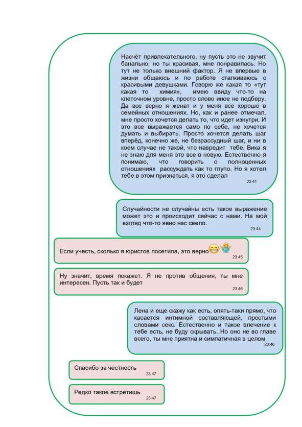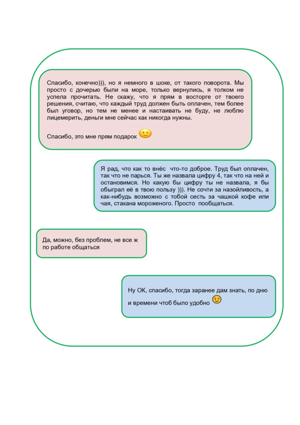 Потом она передала ему денежные средства в сумме 12 тысяч рублей, еще немного поговорив о делах, потом они сказали друг другу до свидания. В итоге, в этот день Дмитрий впервые перешел с ней в беседе на «ТЫ», а также признался в том, что она ему нравится.