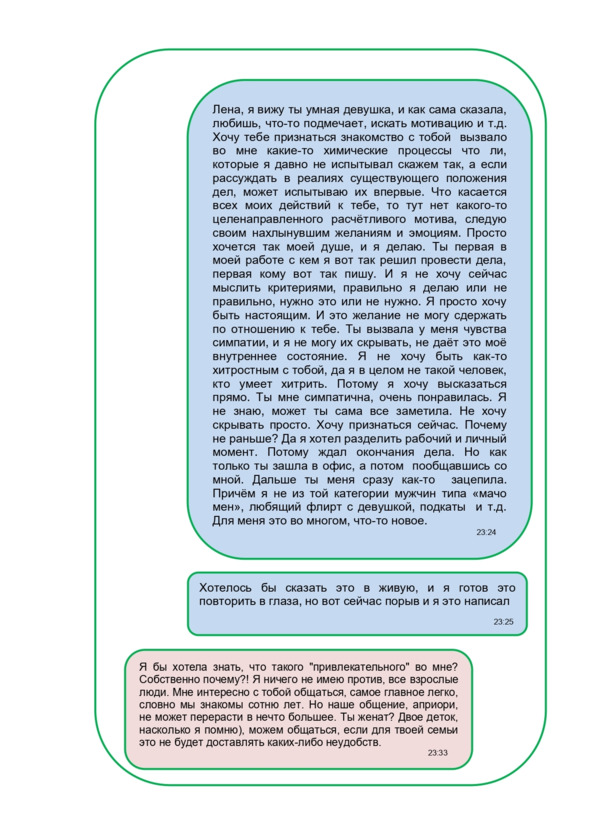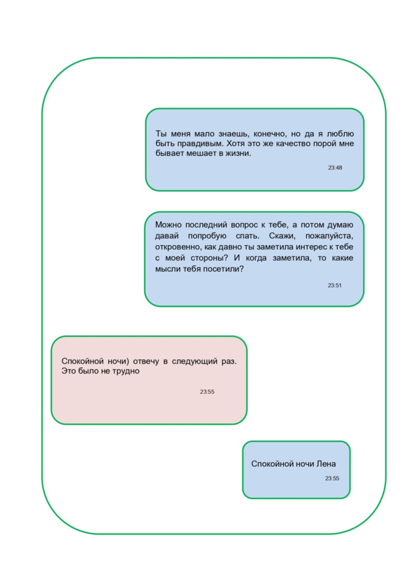 Проходило время, Дмитрий осуществлял свою работу, продолжая заниматься делами Елены. Поводов видеться у них не было, потому лишь изредка они ненадолго переписывались в мессенджерах. Инициатором таких сообщений всегда выступал Дмитрий, который периодически оправлял ей сообщения с пожеланиями доброго утра и хорошего дня, иногда присылал какое-нибудь веселое видео или картинку, смешной анекдот и т. д. На эти сообщения Елена чаще всего отвечала кратко и просто незамысловатым смайликом. Но ему было приятна от нее даже такая незначительная реакция.