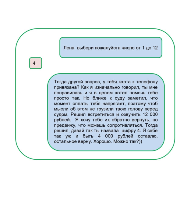 Он решил: «Она заплатила мне 12 тысяч рублей, сейчас напишу ей сообщение и попрошу назвать любую цифру от 1 до 12 и не зависимо от того какую цифру она выберет, найду способ сделать перерасчет в ее пользу».
