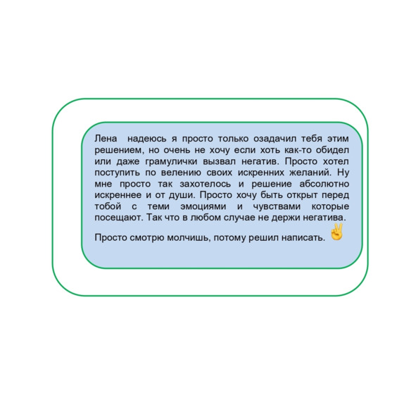 Он был словно как юный мальчишка аквалангист, который хочет исследовать глубины морского дна. Он нуждался в ней как в новом глотке воздуха. Его охватила любовь, за прожитые 40 лет жизни, он впервые испытал подобное. Через пару дней 12.06.2020 г. он решил ей написать, он прислал ей картинку, в которой было пожелание доброго утро и хорошего дня, в ответ она написала.