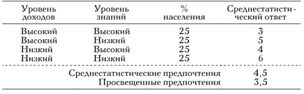 Чтобы рассчитать средний уровень просвещенных предпочтений для всех респондентов, необходимо заменить среднестатистические ответы респондентов с низким уровнем знаний среднестатистическими ответами респондентов с высоким уровнем знаний и тем же уровнем дохода. Присвоим среднестатистическое значение богатых респондентов с высоким уровнем знаний (3) всем богатым респондентам. Присвоим среднестатистическое значение бедных респондентов с высоким уровнем знаний (4) всем бедным респондентам. Новое среднее значение (3,5) будет среднестатистическим значением просвещенных предпочтений всех респондентов.