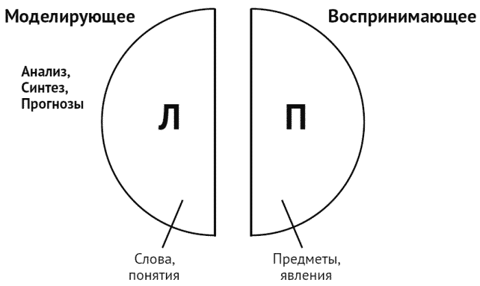 Как вы мыслитеУ нас есть правое и левое полушарие. Правое полушарие – воспринимающее, анализирующее, а левое – моделирующее, создающее модель мира. Правое полушарие работает на языке картинок, образов, левое – на языке схем, цифр, логики и т. д. Это вторая сигнальная система, отличающая нас от животных.