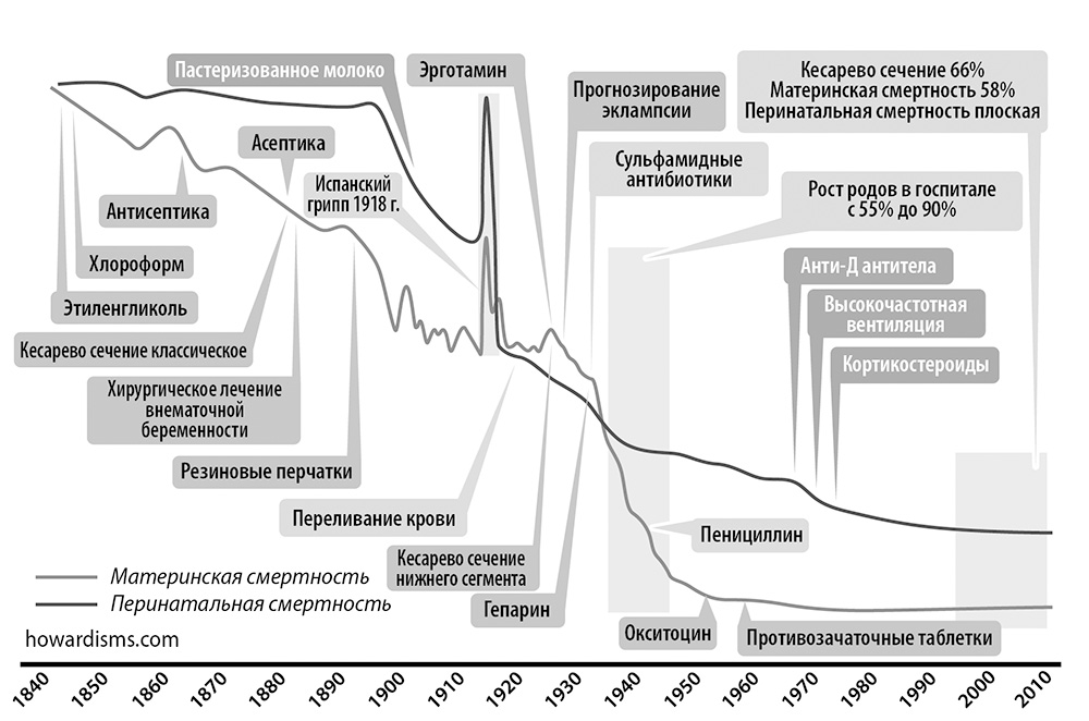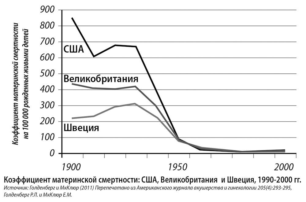 В августе 2011 года американский журнал перинатологии назвал кесарево сечение, как средство сохранения жизни матери и ребенка, «одним из важнейших достижений современной медицины». График 1 наглядно показывает сокращение смертности в Америке, Великобритании, Щвеции. График 2 демонстрирует медицинские технологии, повлиявшие на это: кесарево сечение, антибиотики, заместительная электролитная терапия и безопасные переливания крови. Общественность была довольна. Женщины, по сути, отказывались от выбора, передав ответственность за рождение детей медицинским институтам. Проще говоря, верили врачам-акушерам больше, чем себе.