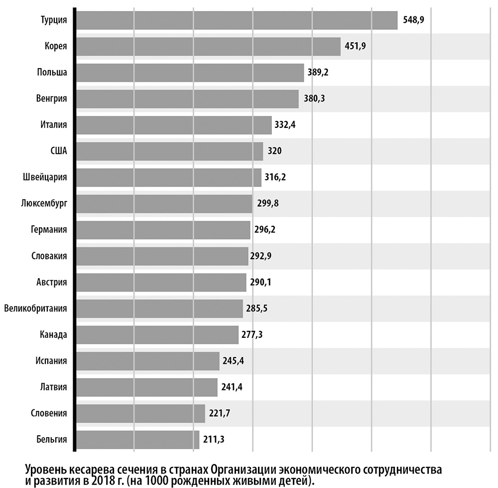 Конец XX и первые десятилетия XXI века прошли под тремя ключевыми трендами: рост количества родов в больницах, объемов различных вмешательств и числа кесаревых сечений. По статистике США, роды в домашних условиях последние десятилетия составляют не более 1–2 %. В развитых странах Западной Европы и в России картина примерно такая же. Исключение составляет Голландия – несмотря на высокий уровень жизни, еще в 1965 году две трети родов происходили в домашних условиях. Сегодня их стало меньше – примерно 20 %, – но показатели по-прежнему высокие [8].