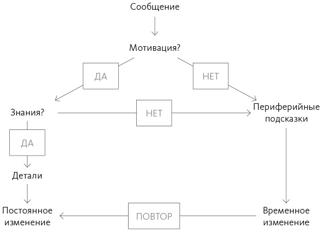 Почему я выделяю именно эти типы? Это очень важный вопрос, я призываю задавать его всякий раз, когда вы сталкиваетесь с какими-либо типологиями. К сожалению, этот вопрос также очень сложный, и для ответа на него мне придется воспользоваться академической теорией с абсолютно монструозным названием «Модель вероятности осознанной обработки информации»[5]. Она была создана в 80-е годы прошлого века американскими исследователями коммуникации Ричардом Петти и Джоном Качиоппо. Эта модель в очень упрощенном виде пытается описать то, как люди воспринимают и обрабатывают новую информацию.