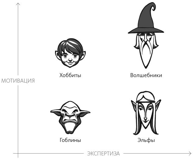 Когда я впервые увидел эту матрицу в своем воображении, я куда-то шел по улице. Идя по улице, я обнаружил, что на этой воображаемой картинке есть один угол, который притягивает мое внимание больше всего. Это левый нижний угол! Я знаю этот угол очень хорошо, и я знаю людей, которые его населяют. Я называю эту аудиторию «гоблины». Поскольку у меня уже было одно название, я и дальше стал использовать терминологию Толкина. Это также можно объяснить с помощью легендариума Гарри Поттера или «Звездных войн», если захочется. Но в моем детстве был Толкин.