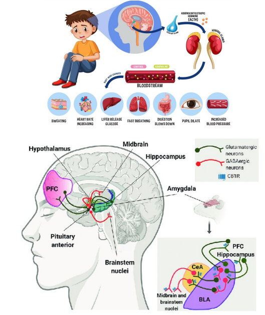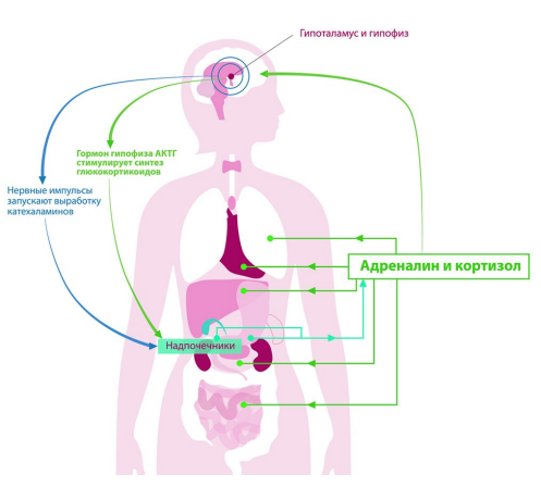Всё начинается с выброса гормонов. Надпочечники, как по сигналу тревоги, выбрасывают в кровь адреналин и кортизол. Эти гормоны вызывают целый каскад изменений: