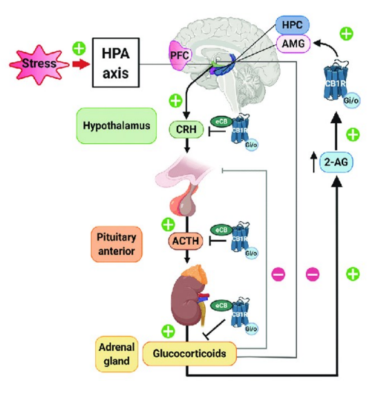Затем следует активация гипоталамо-гипофизарно-надпочечниковой (ГГН) оси – это своего рода "гормональная фабрика" стресса. По сигналу амигдалы гипоталамус (дирижёр всего процесса) выпускает кортикотропин-рилизинг гормон (КРГ). КРГ, как курьер, доставляет сообщение в гипофиз, который, в свою очередь, выделяет адренокортикотропный гормон (АКТГ). АКТГ летит к надпочечникам, нашим маленьким "гормональным железам-производителям", расположенным над почками, и стимулирует их вырабатывать кортизол – главный гормон стресса. Кортизол, словно топливо, подготавливает организм к длительному сопротивлению.