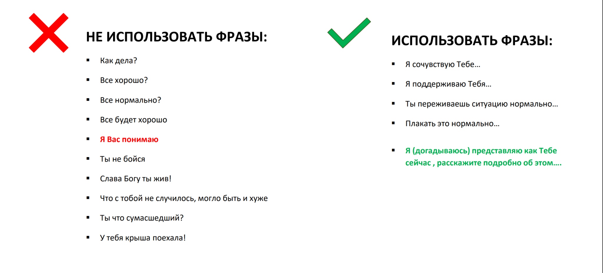 При общении с пострадавшим: Слышать и действовать
