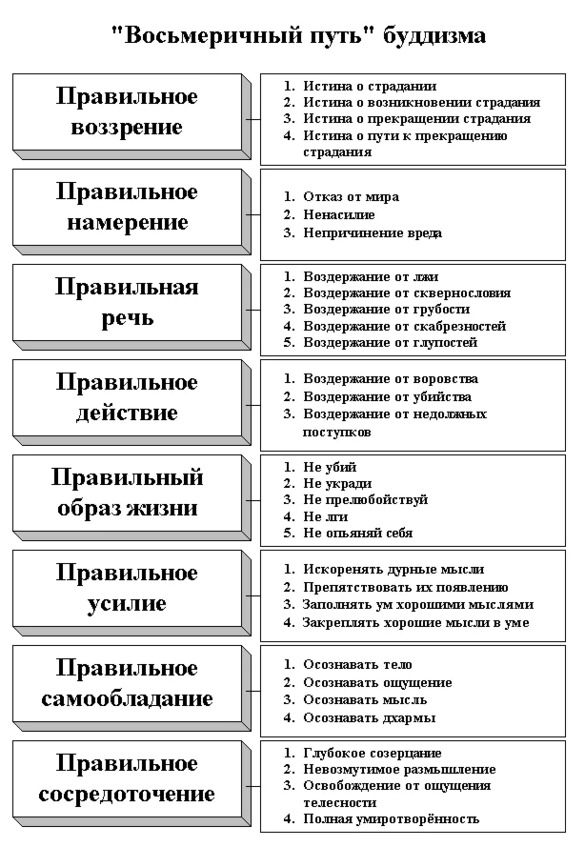 4. Существует путь, ведущий к освобождению от страданий, – благородный восьмеричный путь правильных воззрений, размышлений, речей, действий, способов – поддержания жизни, приложения сил, памятования и сосредоточения.