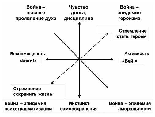 В условиях мощнейших психологических факторов боя (постоянная опасность, новизна ситуации, полная неизвестность исхода, неопределенность) воин оказывается на распутье между множеством "раздирающих" биполярных тенденций: