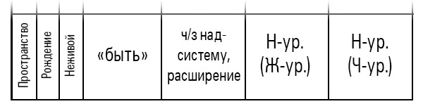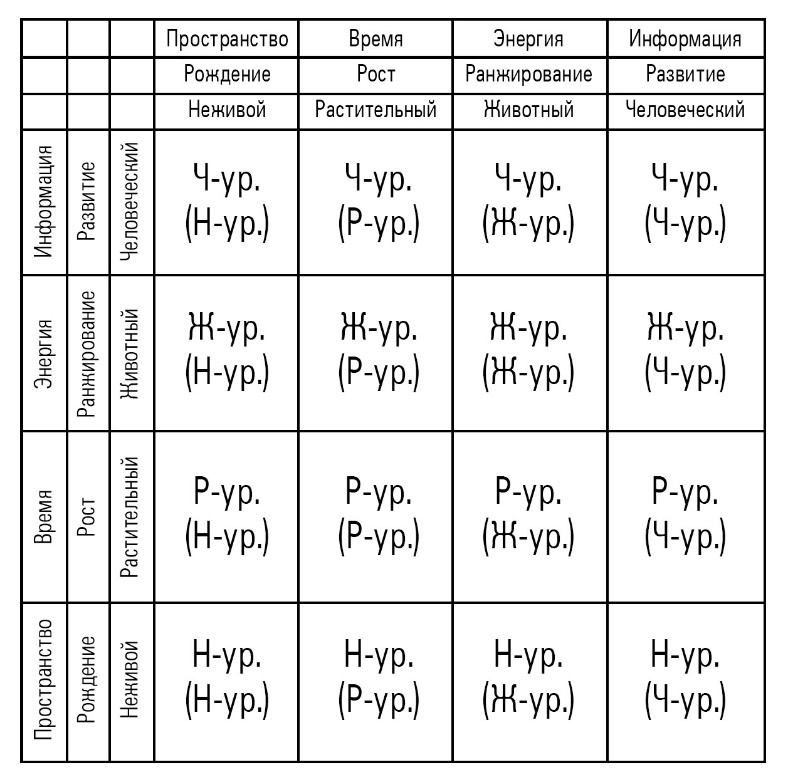 Условимся, что строки в этой таблице представляют систему конкретного уровня природы (камень, растение, животное, человек), а столбцы – свойства соответствующего уровня. Так мы сделаем наглядное наложение свойств разных уровней друг на друга. Систенции ПВЭИ и РРРР играют в этой таблице вспомогательную роль и будут “подсказывать”, как можно увидеть свойства той или иной ячейки.