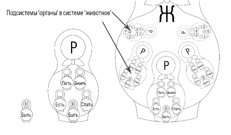 У нас получилось, что желания Неживого уровня природы вложены в набор желаний Растительного уровня. Это можно представить в виде каменной Н-матрёшки (Неживой уровень) вложенной в цветущую Р-матрёшку (Растительный уровень). К желаниям тела Р-уровня7 мы будем относить такие желания тела как: есть, пить, дышать, спать.