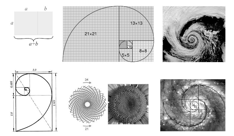 Рисунок 5. Примеры золотого сечения и спиралей Фибоначчи.
