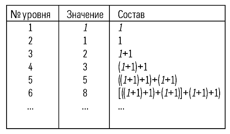Принцип, по которому строится последовательность Фибоначчи, математически похожа на основной природный системный принцип: система есть “сумма” (на самом деле синергия) своих подсистем. Для чисел Фибоначчи это можно изобразить так: