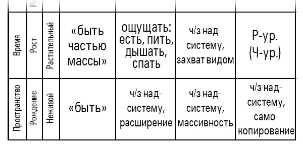 Перейдём на строчку выше в нашей таблице. Деятельность прото-РНК привела к созданию системы 'одноклеточный организм, который является частью массы таких же систем'. В ячейку Р-ур.(Н-ур.) мы запишем усовершенствованное свойство «быть» – «сохранить свою форму», так мы подчеркнём важную природную иерархию, интенцию природы быть проявленной в пространстве, – а уж булыжником или кустом это уже потом, “сверху” этого. В дополнение к этому свойству здесь запишем также впервые проявляющуюся интенцию «быть частью массы».