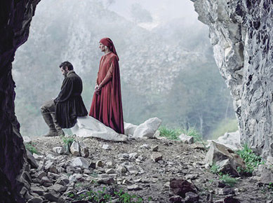 В постановочно изощренном фильме Кончаловский сделал все, чтобы отыграть-обыграть именно призрачность вертикали как некой потусторонней, не имеющей прямого отношения к жизни силы. Сначала эта вертикаль возникает на экране вместе с мотивом поклонения Микеланджело великому предшественнику – заоблачно и недостижимо идеальному Данте Алигьери. В конце картины появляется сам Данте: духовный исполин, облаченный в красный широкий плащ-гуарнакку, он неожиданно материализуется в доме главного героя словно из воздуха. Затем вместе с Микеланджело Данте переносится в горный сакральный пейзаж и отвечает на скорбные вопрошания главного героя. Слова Данте звучат почти как слова Мессии: «Слушай!»