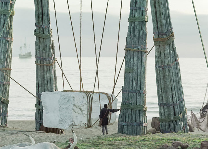 Трудно представить более выразительную концовку коллизии с Монстром, чем та, которая придумана в фильме: уже на берегу моря приготовленный к отправке Монстр висит на растяжке из толстенных канатов, в обрамлении специально построенной для него рамы – сложной и красивой инженерной конструкции из дерева, подобной гигантскому троянскому коню. В этом подвешенном состоянии в силу сложившихся по сюжету обстоятельств Монстру и суждено пребывать (как понимаем и мы, и герой) неопределенно долго.