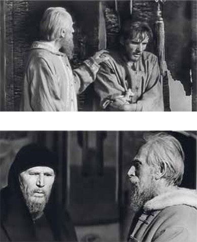 Именно после разговора с покойным мастером-иконописцем Рублев совершал весьма не характерный для шестидесятников выбор, окончательно и бесповоротно оформленный в действие, в поступок: не в пользу «низких истин» жизни, которые выбирает антипод Рублева, тщеславный монах-расстрига Кирилл (Иван Лапиков), а в пользу самопознания и обретения себя в посте, в молитве и глубочайшей аскезе (обет молчания)[28].