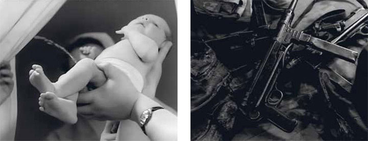 По сюжету в конце картины Александра Алова и Владимира Наумова «Мир входящему» (1961), посвященной последним дням войны, от немецкой матери появляется на свет младенец, который незадачливо пускает символическую струйку на трофейные немецкие автоматы.