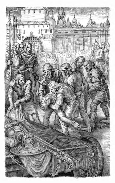 Безмолвие мужей и старцев в великом граде было ужаснее вопля жен малодушных… Скоро посадница ободрилась и велела отпереть врата Московские. Беглецы не смели явиться народу и скрывались в домах. Колесница медленно приближалась к Великой площади. Вокруг ее шли, потупив глаза в землю – с горестию, но без стыда, – люди житые и воины чужеземные; кровь запеклась на их оружии; обломанные щиты, обрубленные шлемы показывали следы бесчисленных ударов неприятельских. Под сению знамен, над телом вождя, сидел Михаил Храбрый, бледный, окровавленный; ветер развевал его черные волосы, и томная глава склонялась ко груди.
