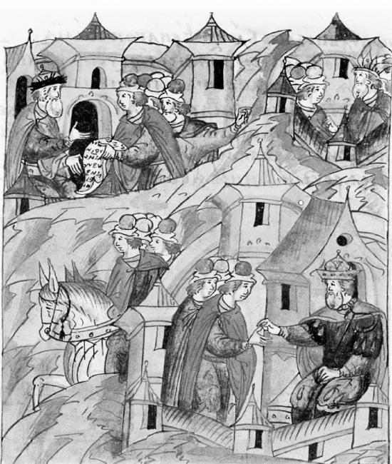 Альбрехт Бранденбург-Ансбахский обменивается дипломатами с Василием III. Миниатюра из Лицевого летописного свода, XVI в.
