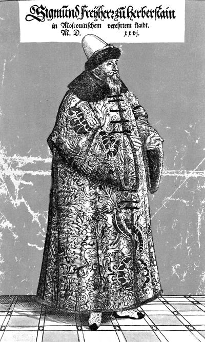С. Герберштейн в одежде, подаренной великим князем. Рисунок из «Записок о Московии» С. Герберштейна, 1556 г.