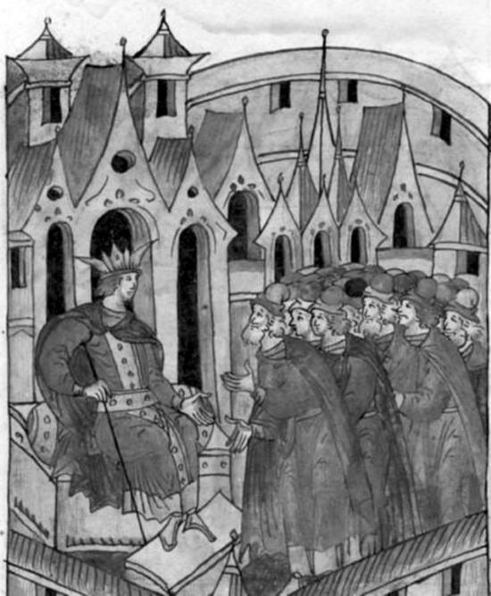 Царь Шиг-Алей на престоле в Казани. Миниатюра из Лицевого летописного свода, XVI в.