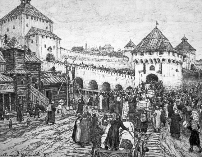 А. М. Васнецов. В осадном сидении. Троицкий мост и башня Кутафья
