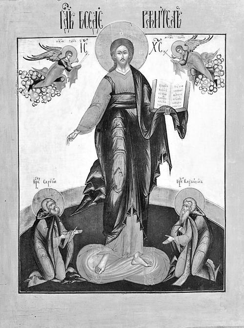 Спас Смоленский с припадающими Сергием и Варлаамом. Икона посвящена видению монахине Спаса с преподобными во время нашествия татар при Василии Ивановиче