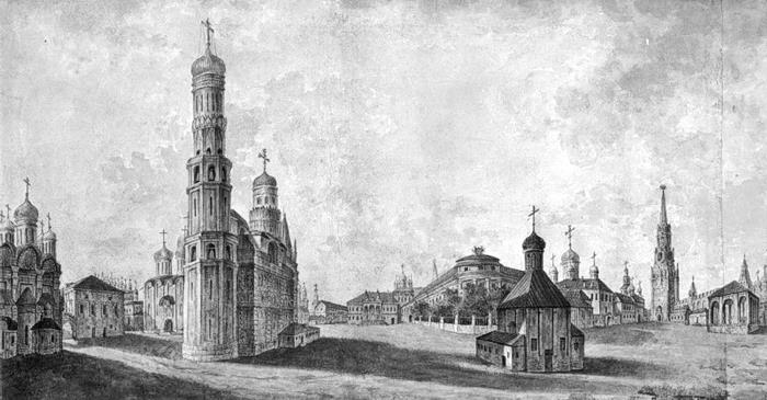 Ф. Я. Алексеев. Панорама Ивановской площади. Церковь Николы Голунского справа на переднем плане. Графика к. XVIII – нач. XIX в.
